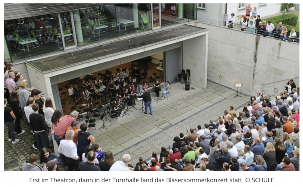 Das Bläsersommerkonzert an der Mädchenrealschule Heilig Blut unter Leitung von Martin Hirsch hat Tradition. Dabei können die jungen Musikerinnen zeigen, was sie während des Schuljahres zusammen erarbeitet haben. Auch der Blick zum Himmel gehört dazu, schließlich findet das Konzert im Theatron unter freiem Himmel statt. Heuer wollte Petrus nicht ganz mitspielen, und so zog man während der Pause blitzschnell in die Turnhalle um.